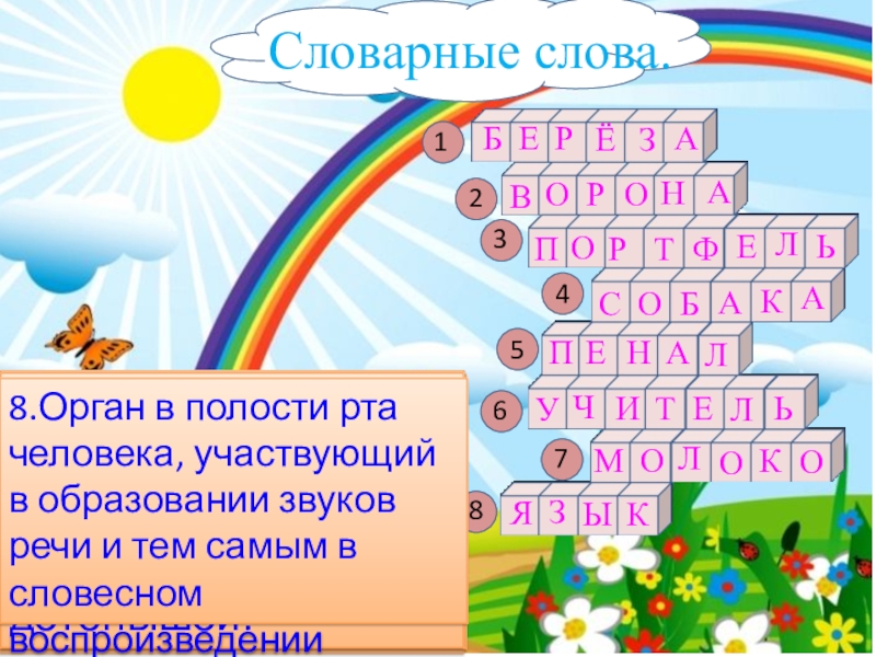 8.Орган в полости рта человека, участвующий в образовании звуков речи и тем самым в словесном воспроизведении мыслей.