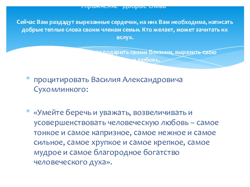 Сейчас Вам раздадут вырезанные сердечки, на них Вам необходима, написать добрые теплые слова своим членам семьи. Кто желает, может зачитать их вслух.