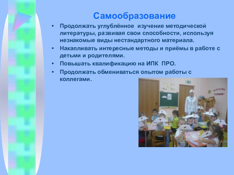 СамообразованиеПродолжать углублённое изучение методической литературы, развивая свои способности, используя незнакомые виды нестандартного материала.Накапливать интересные методы и приёмы