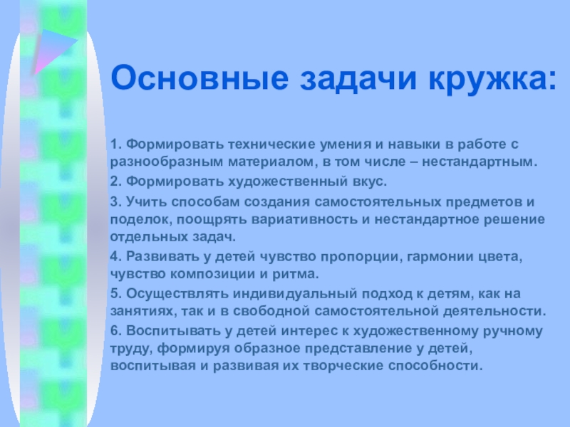 Основные задачи кружка:1. Формировать технические умения и навыки в работе с разнообразным материалом, в том