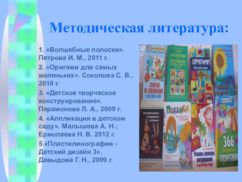 Методическая литература:1. «Волшебные полоски». Петрова И. М., 2011 г.2. «Оригами для самых маленьких». Соколова С. В., 2010