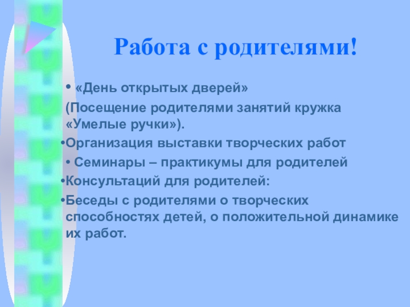 Работа с родителями!• «День открытых дверей»(Посещение родителями занятий кружка «Умелые ручки»).Организация выставки творческих работ• Семинары – практикумы