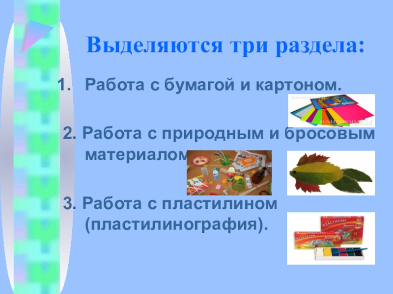 Выделяются три раздела:Работа с бумагой и картоном.2. Работа с природным и бросовым материалом.3. Работа с пластилином (пластилинография).