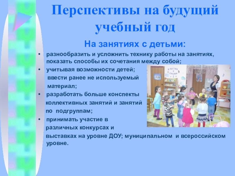 Перспективы на будущий учебный годНа занятиях с детьми:разнообразить и усложнить технику работы на занятиях, показать способы их