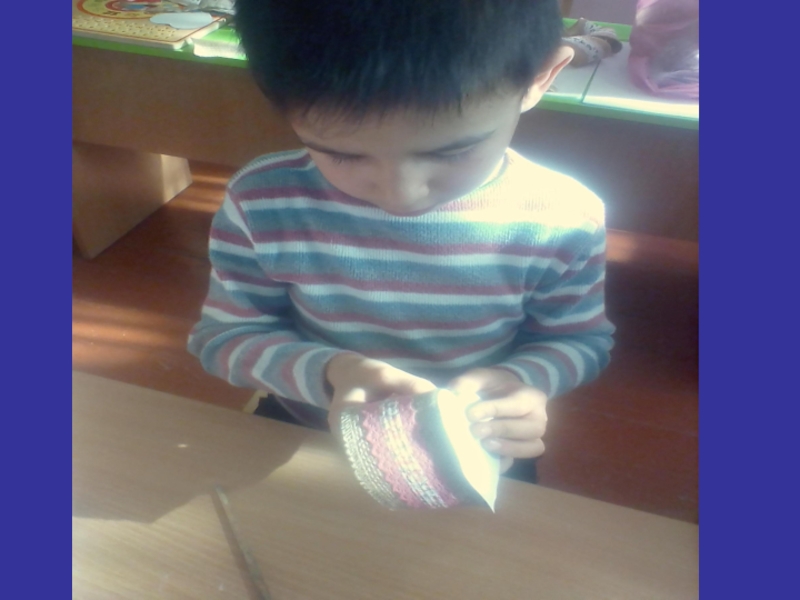Цель: Знакомство детей с использованием нетрадиционных материалов.Задачи: образовательные: Познакомить детей с нетрадиционной техникой работы с джутовой лентой, картоном. Подвести детей к умению самостоятельно пользоваться инструкцией выполнения работы.  Повторить знания направлений: вверху, внизу, слева, справа, лицевая и изнаночная