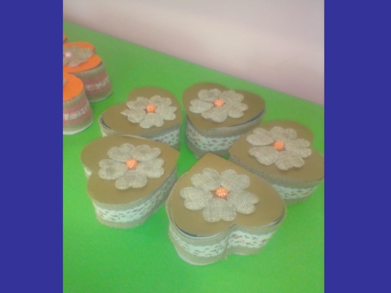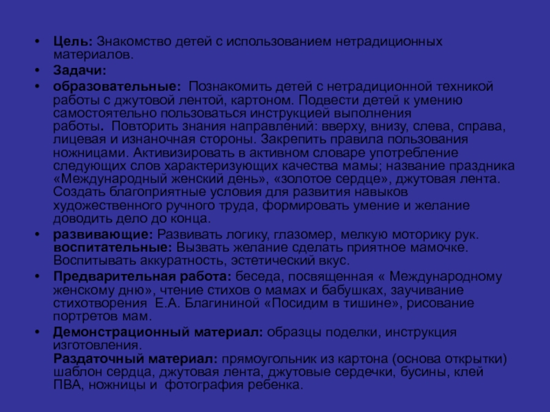 техникой работы с джутовой лентой, картоном. Подвести детей к умению самостоятельно пользоваться инструкцией выполнения работы.  Повторить знания направлений: вверху, внизу, слева, справа, лицевая и изнаночная стороны. Закрепить правила пользования ножницами. Активизировать в активном словаре употребление следующих слов характеризующих качества мамы; название праздника «Международный женский день», «золотое сердце», джутовая лента. Создать благоприятные условия для развития навыков художественного ручного труда, формировать умение и желание доводить дело до конца.