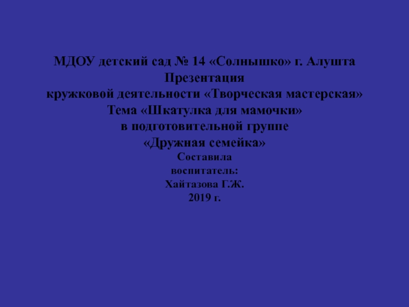 МДОУ детский сад № 14 «Солнышко» г. Алушта Презентация кружковой деятельности «Творческая мастерская» Тема «Шкатулка для мамочки»
