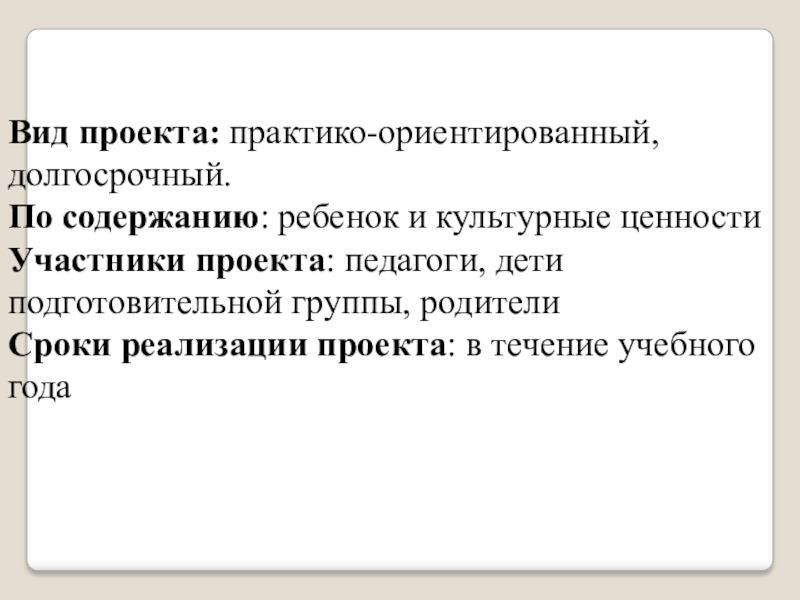 Вид проекта: практико-ориентированный, долгосрочный.По содержанию: ребенок и культурные ценностиУчастники проекта: педагоги, дети подготовительной группы, родителиСроки реализации проекта: в течение учебного года
