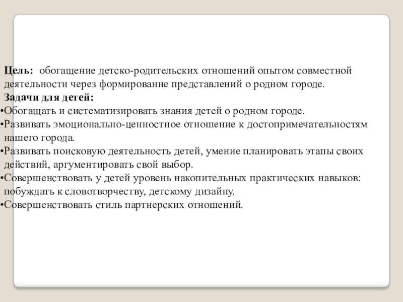 Цель: обогащение детско-родительских отношений опытом совместной деятельности через формирование представлений о родном городе.Задачи для детей: Обогащать и
