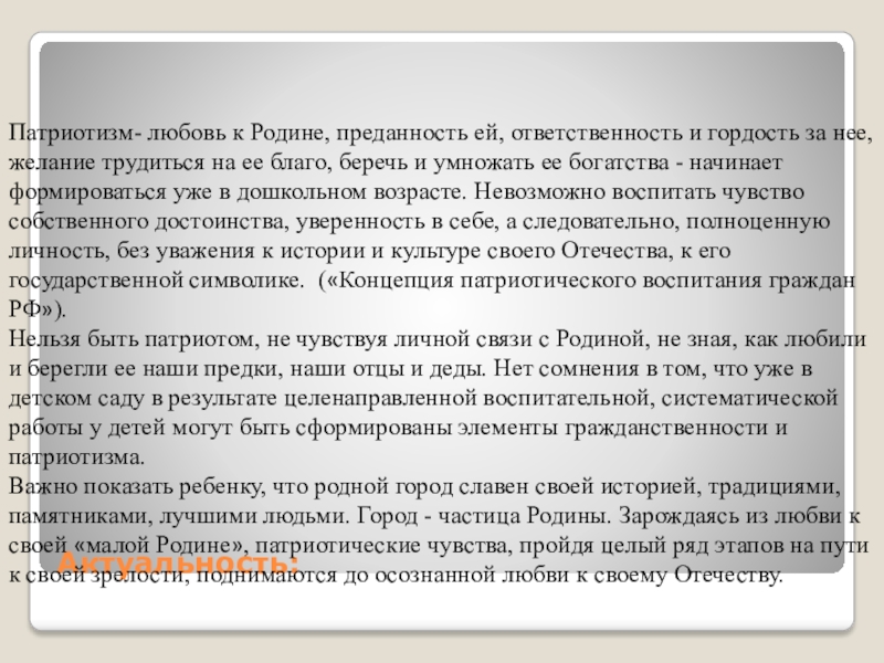 желание трудиться на ее благо, беречь и умножать ее богатства - начинает формироваться уже в дошкольном возрасте. Невозможно воспитать чувство собственного достоинства, уверенность в себе, а следовательно, полноценную личность, без уважения к истории и культуре своего Отечества, к его государственной символике. («Концепция патриотического воспитания граждан РФ»).