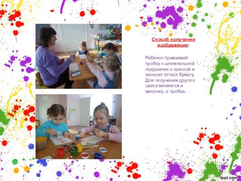 Способ получения изображения: Ребенок прижимает пробку к штемпельной подушечке с краской и наносит оттиск бумагу. Для получения