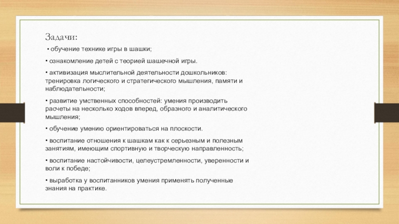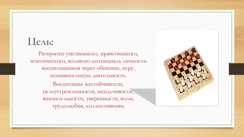 • воспитание отношения к шашкам как к серьезным и полезным занятиям, имеющим спортивную и творческую направленность;