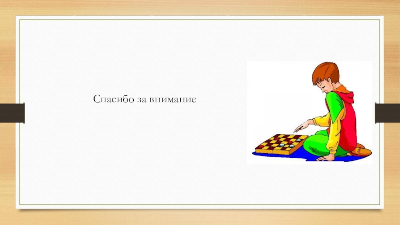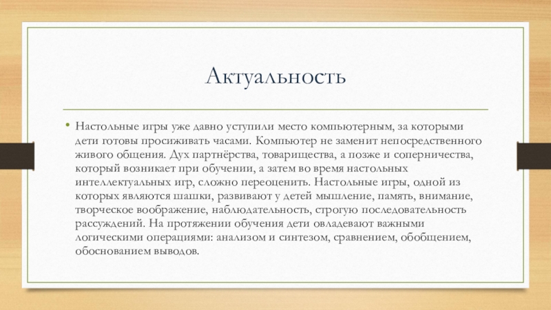 просиживать часами. Компьютер не заменит непосредственного живого общения. Дух партнёрства, товарищества, а позже и соперничества, который возникает при обучении, а затем во время настольных интеллектуальных игр, сложно переоценить. Настольные игры, одной из которых являются шашки, развивают у детей мышление, память, внимание, творческое воображение, наблюдательность, строгую последовательность рассуждений. На протяжении обучения дети овладевают важными логическими операциями: анализом и синтезом, сравнением, обобщением, обоснованием выводов.