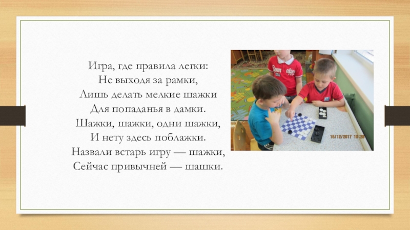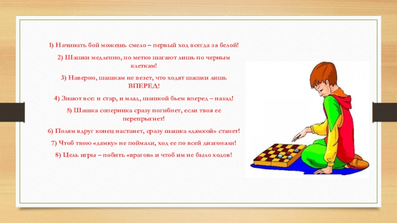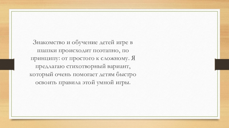 с новым для них материалом необходимо в простой и очень доступной для их понимания форме. Например, рассказывать детям о правилах игры в шашки можно в виде сказки или в стихотворном варианте. Правила игры в шашки на первый взгляд кажутся несложными, но эта игра содержит в себе много разного рода трудностей и тонкостей. Для того, чтобы дети хорошо научились играть в шашки, нужны систематические занятия, которые заключают в себе минимум теории и максимум практики.