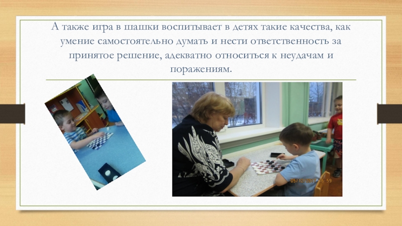 Слайд 6А также игра в шашки воспитывает в детях такие качества, как