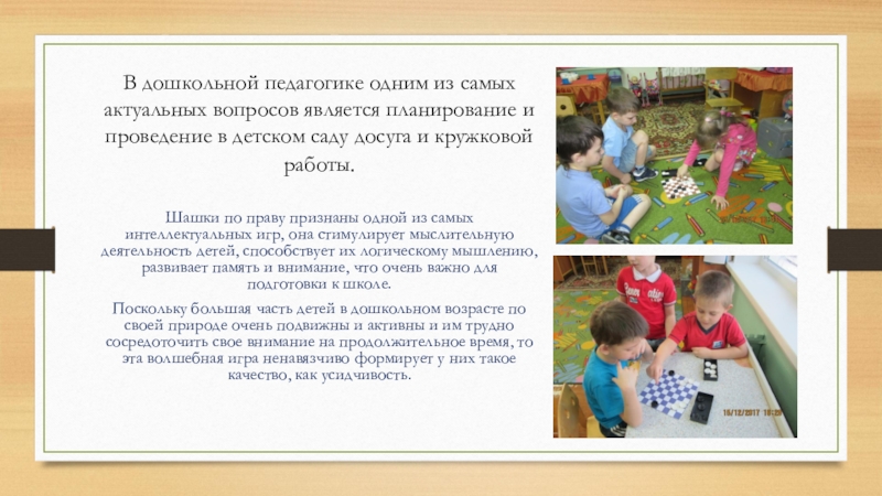 Шашки по праву признаны одной из самых интеллектуальных игр, она стимулирует мыслительную деятельность детей, способствует их логическому мышлению, развивает память и внимание, что очень важно для подготовки к школе.