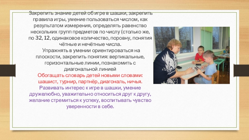 Закрепить знание детей об игре в шашки, закрепить правила игры, умение
