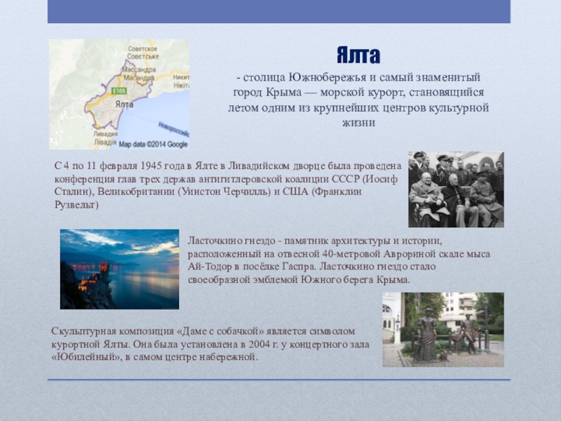 С 4 по 11 февраля 1945 года в Ялте в Ливадийском дворце была проведена конференция глав трех держав антигитлеровской коалиции СССР (Иосиф Сталин), Великобритании (Уинстон Черчилль) и США (Франклин Рузвельт)