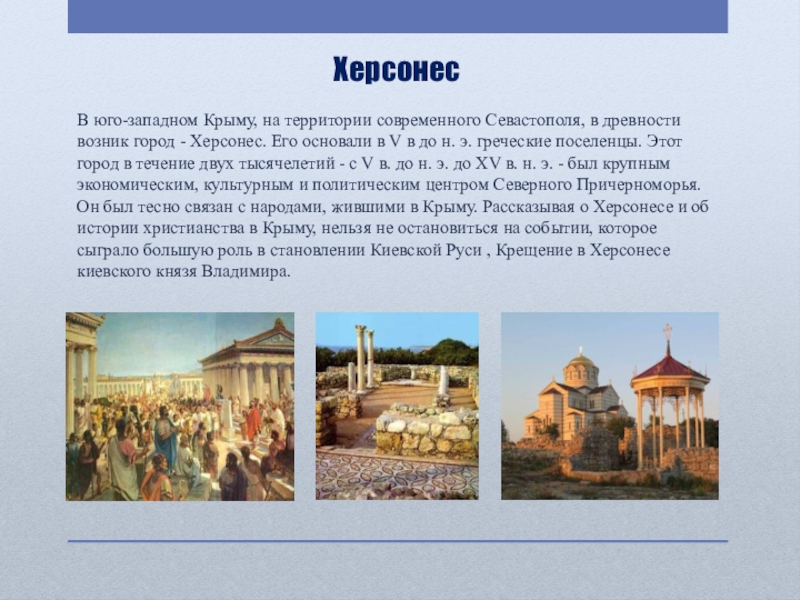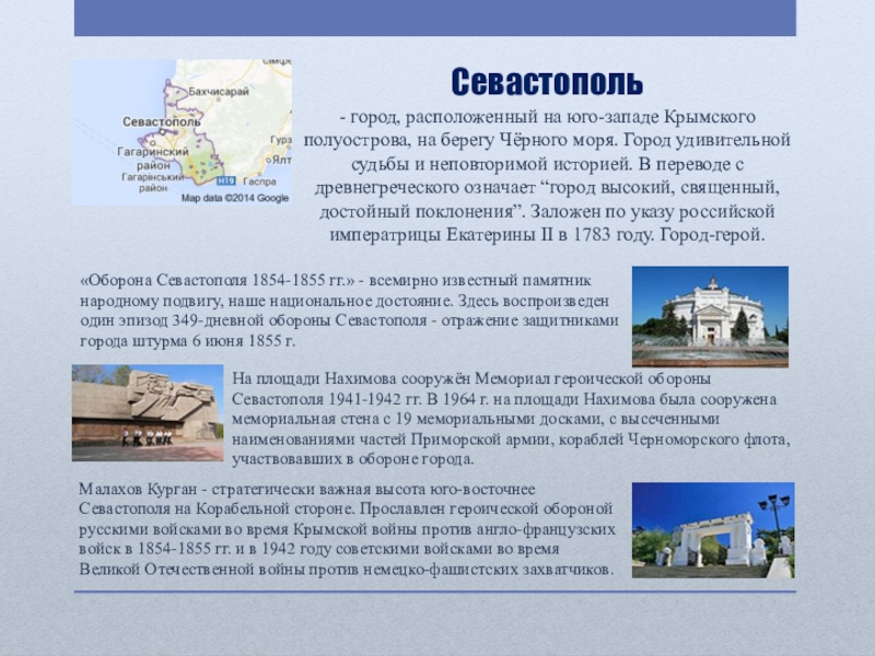 - город, расположенный на юго-западе Крымского полуострова, на берегу Чёрного моря. Город удивительной судьбы и неповторимой историей. В переводе с древнегреческого означает “город высокий, священный, достойный поклонения”. Заложен по указу российской императрицы Екатерины II в 1783 году. Город-герой.