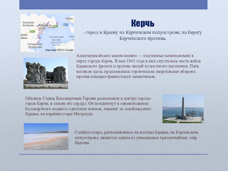 Аджимушкайские каменоломни — подземные каменоломни в черте города Керчь. В мае 1942 года в них спустилась часть войск Крымского фронта и группы людей из местного населения. Пять месяцев здесь продолжалась героическая смертельная оборона против немецко-фашистских захватчиков.
