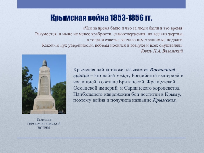 Крымская война также называется Восточной войной – это война между Российской империей и коалицией в составе Британской, Французской, Османской империй и Сардинского королевства. Наибольшего напряжения бои достигли в Крыму, поэтому война и получила название Крымская.