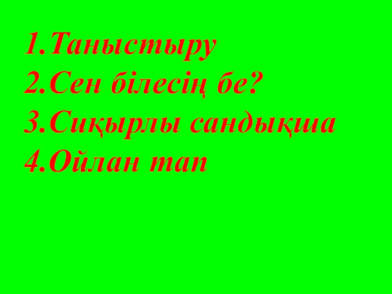 Слайд 2 1.Таныстыру 2.Сен білесің бе? 3.Сиқырлы сандықша 4.Ойлан тап