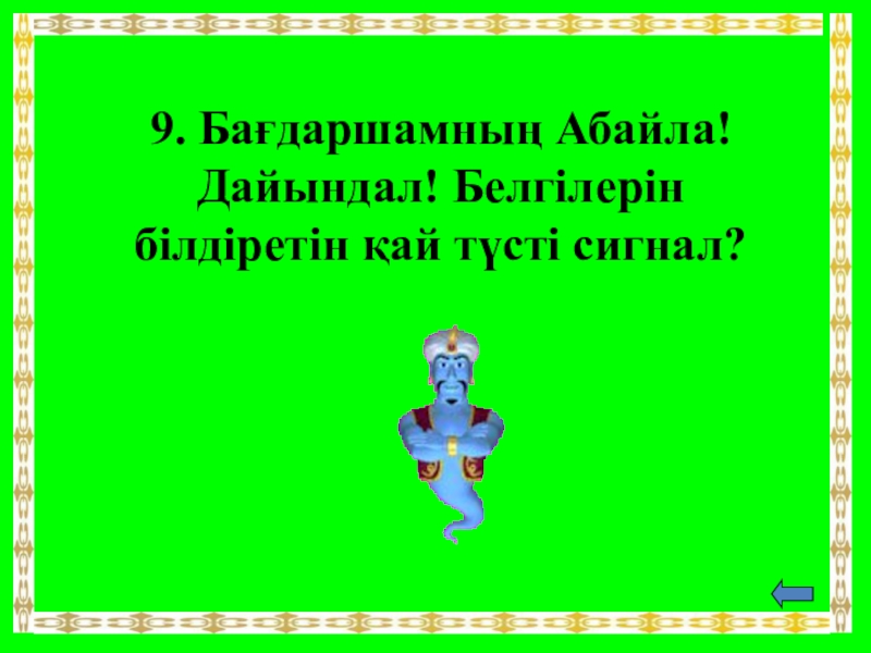 Слайд 249. Бағдаршамның Абайла!Дайындал! Белгілерін білдіретін қай түсті сигнал?