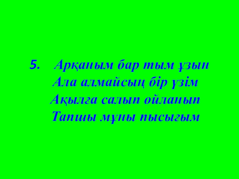 5.  Арқаным бар тым ұзын 	Ала алмайсың бір үзім 	Ақылға салып ойланып 	Тапшы мұны пысығым