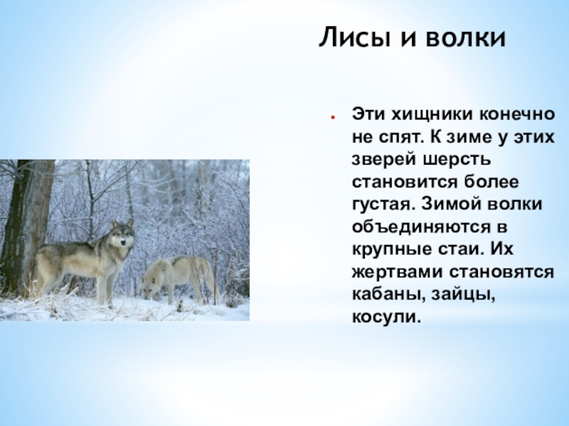 зверей шерсть становится более густая. Зимой волки объединяются в крупные стаи. Их жертвами становятся кабаны, зайцы, косули.