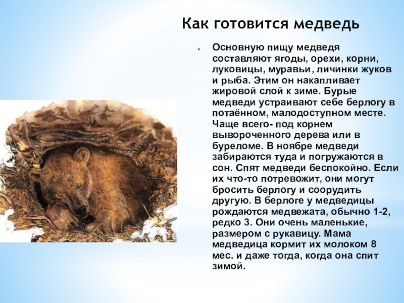 личинки жуков и рыба. Этим он накапливает жировой слой к зиме. Бурые медведи устраивают себе берлогу в потаённом, малодоступном месте. Чаще всего- под корнем вывороченного дерева или в буреломе. В ноябре медведи забираются туда и погружаются в сон. Спят медведи беспокойно. Если их что-то потревожит, они могут бросить берлогу и соорудить другую. В берлоге у медведицы рождаются медвежата, обычно 1-2, редко 3. Они очень маленькие, размером с рукавицу. Мама медведица кормит их молоком 8 мес. и даже тогда, когда она спит зимой.