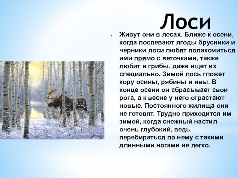 и черники лоси любят полакомиться ими прямо с веточками, также любит и грибы, даже ищет их специально. Зимой лось гложет кору осины, рябины и ивы. В конце осени он сбрасывает свои рога, а к весне у него отрастают новые. Постоянного жилища они не готовят. Трудно приходится им зимой, когда снежный настил очень глубокий, ведь перебираться по нему с такими длинными ногами не легко.