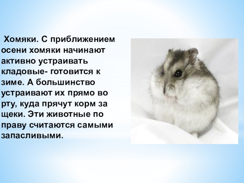 Слайд 12 Хомяки. С приближением осени хомяки начинают активно устраивать кладовые- готовится