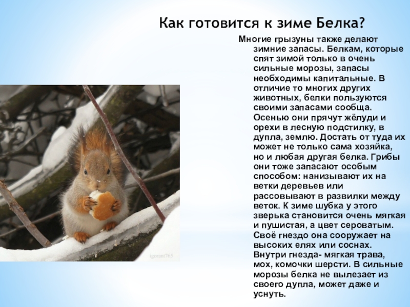 которые спят зимой только в очень сильные морозы, запасы необходимы капитальные. В отличие то многих других животных, белки пользуются своими запасами сообща. Осенью они прячут жёлуди и орехи в лесную подстилку, в дупла, землю. Достать от туда их может не только сама хозяйка, но и любая другая белка. Грибы они тоже запасают особым способом: нанизывают их на ветки деревьев или рассовывают в развилки между веток. К зиме шубка у этого зверька становится очень мягкая и пушистая, а цвет сероватым. Своё гнездо она сооружает на высоких елях или соснах. Внутри гнезда- мягкая трава, мох, комочки шерсти. В сильные морозы белка не вылезает из своего дупла, может даже и уснуть.