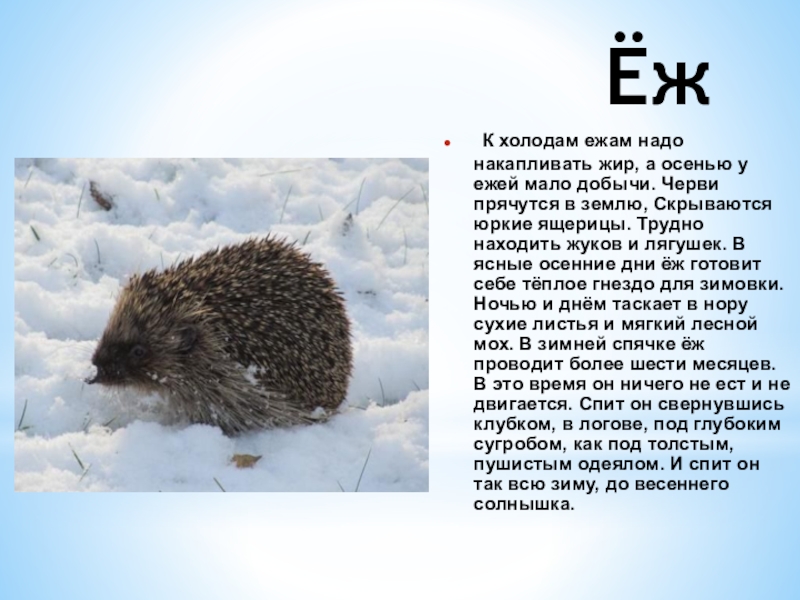 мало добычи. Черви прячутся в землю, Скрываются юркие ящерицы. Трудно находить жуков и лягушек. В ясные осенние дни ёж готовит себе тёплое гнездо для зимовки. Ночью и днём таскает в нору сухие листья и мягкий лесной мох. В зимней спячке ёж проводит более шести месяцев. В это время он ничего не ест и не двигается. Спит он свернувшись клубком, в логове, под глубоким сугробом, как под толстым, пушистым одеялом. И спит он так всю зиму, до весеннего солнышка.