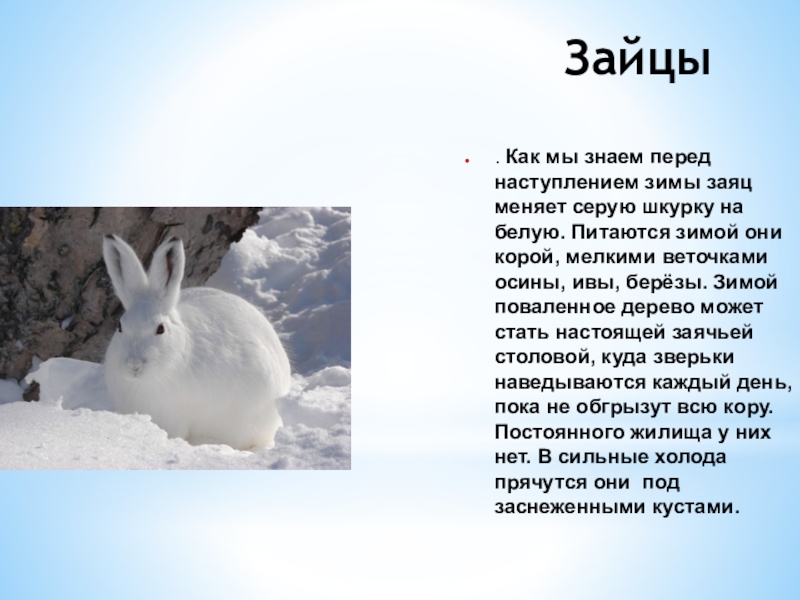 на белую. Питаются зимой они корой, мелкими веточками осины, ивы, берёзы. Зимой поваленное дерево может стать настоящей заячьей столовой, куда зверьки наведываются каждый день, пока не обгрызут всю кору. Постоянного жилища у них нет. В сильные холода прячутся они под заснеженными кустами.