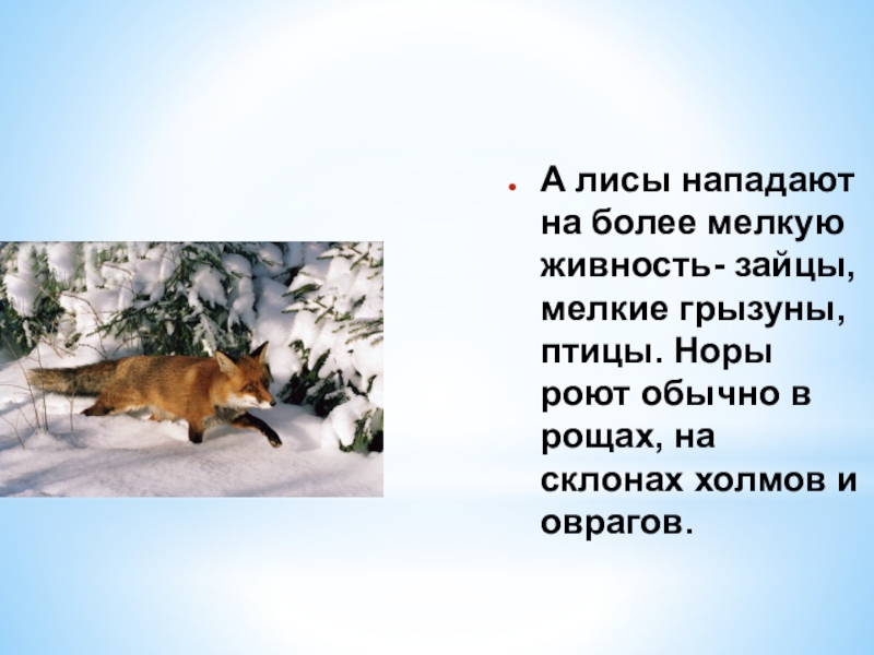 Слайд 7А лисы нападают на более мелкую живность- зайцы, мелкие грызуны, птицы.