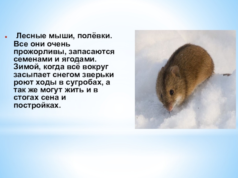 Слайд 13 Лесные мыши, полёвки. Все они очень прожорливы, запасаются семенами и