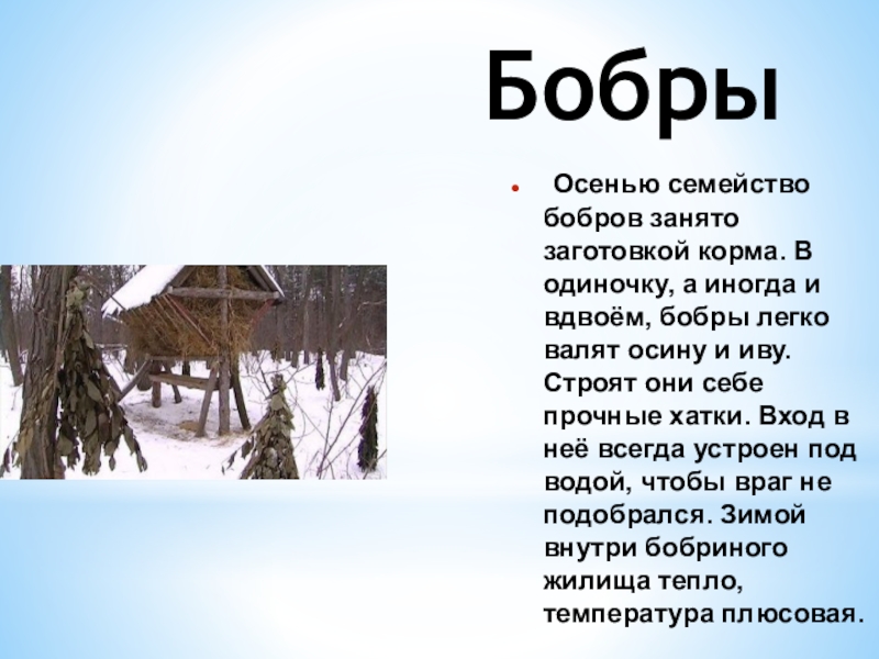 и вдвоём, бобры легко валят осину и иву. Строят они себе прочные хатки. Вход в неё всегда устроен под водой, чтобы враг не подобрался. Зимой внутри бобриного жилища тепло, температура плюсовая.