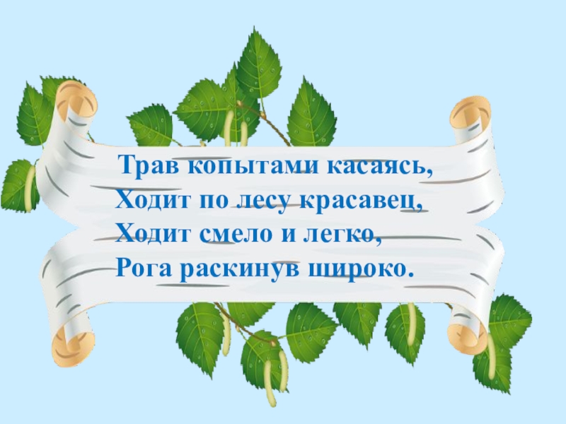 Трав копытами касаясь,Ходит по лесу красавец,Ходит смело и легко,Рога раскинув широко.