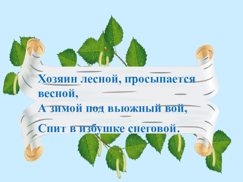 Хозяин лесной, просыпается весной,А зимой под вьюжный вой, Спит в избушке снеговой.