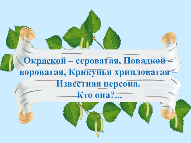 Слайд 24Окраской – сероватая, Повадкой – вороватая, Крикунья хрипловатая – Известная персона.