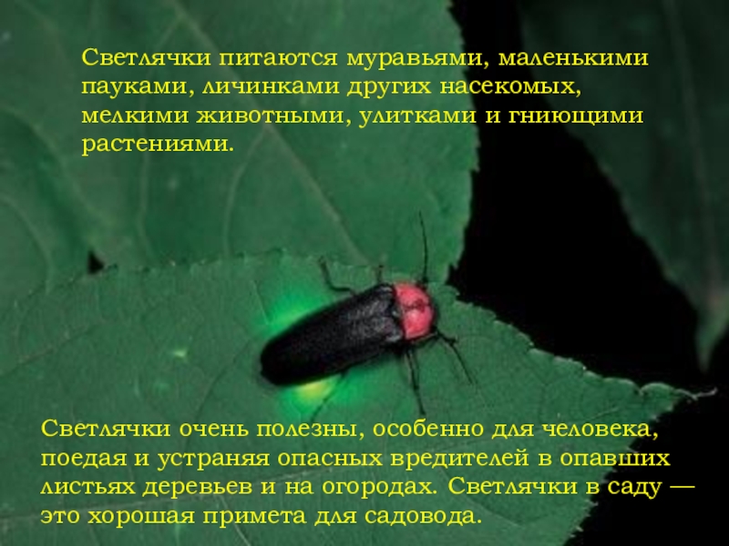 Светлячки очень полезны, особенно для человека, поедая и устраняя опасных вредителей в опавших листьях деревьев и на огородах. Светлячки в саду — это хорошая примета для садовода.