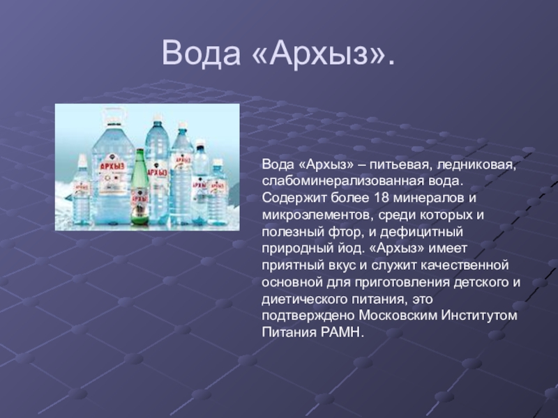 Слайд 4Вода «Архыз».
