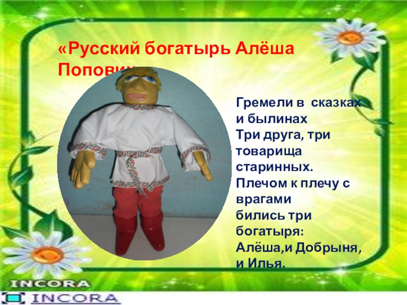 «Русский богатырь Алёша Попович»Гремели в сказках и былинах Три друга, три товарища старинных. Плечом к плечу с