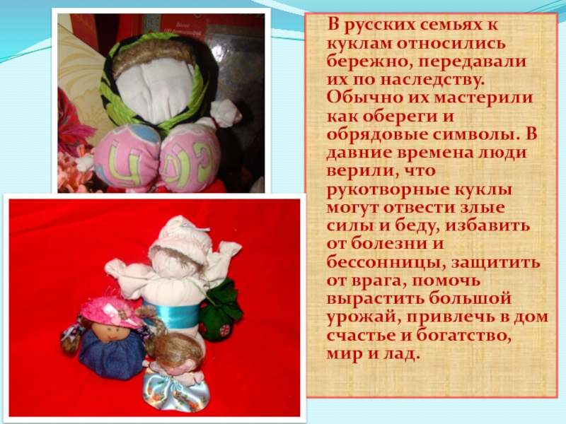 по наследству. Обычно их мастерили как обереги и обрядовые символы. В давние времена люди верили, что рукотворные куклы могут отвести злые силы и беду, избавить от болезни и бессонницы, защитить от врага, помочь вырастить большой урожай, привлечь в дом счастье и богатство, мир и лад.