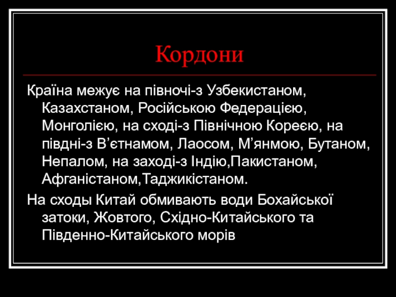 КордониКраїна межує на півночі-з Узбекистаном, Казахстаном, Російською Федерацією, Монголією, на сході-з Північною Кореєю, на півдні-з В’єтнамом, Лаосом,