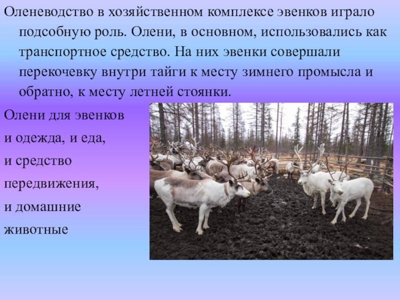 Слайд 8Оленеводство в хозяйственном комплексе эвенков играло подсобную роль. Олени, в основном,