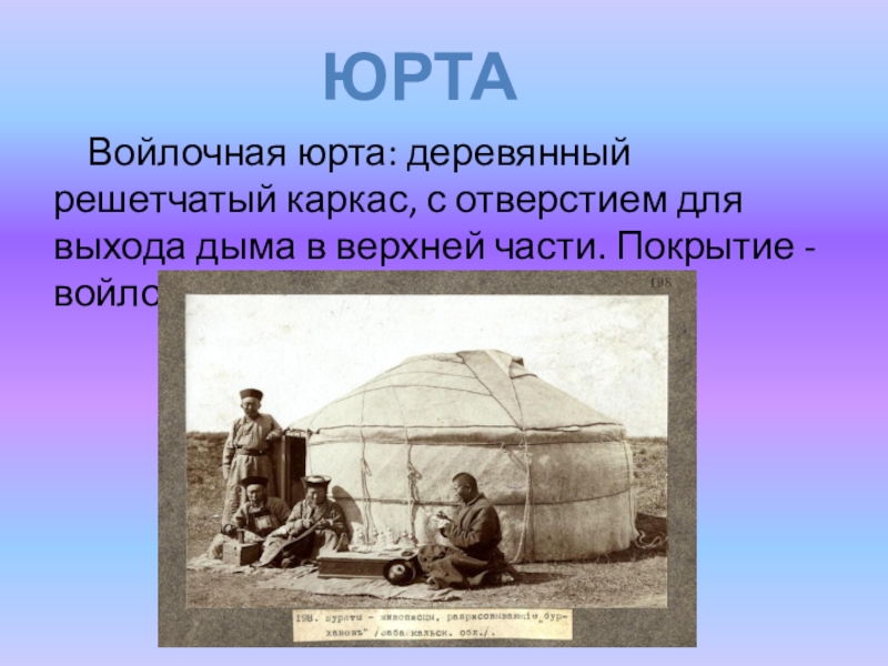 Слайд 27Войлочная юрта: деревянный решетчатый каркас, с отверстием для выхода дыма в