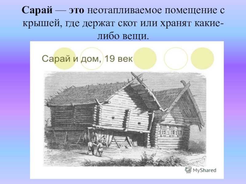 Слайд 47Сарай — это неотапливаемое помещение с крышей, где держат скот или хранят какие-либо вещи.