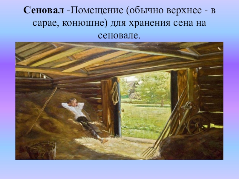 Слайд 48Сеновал -Помещение (обычно верхнее - в сарае, конюшне) для хранения сена